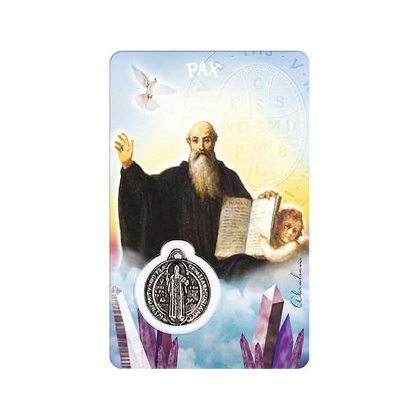 Saint Benoit est un puissant protecteur contre les forces et les énergies négatives. Sa prière est inscrite en latin dans le médaillon inséré dans la carte.